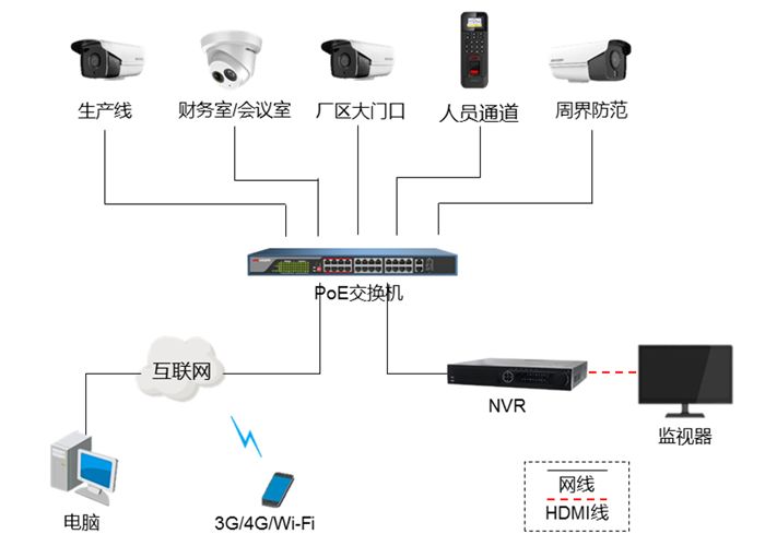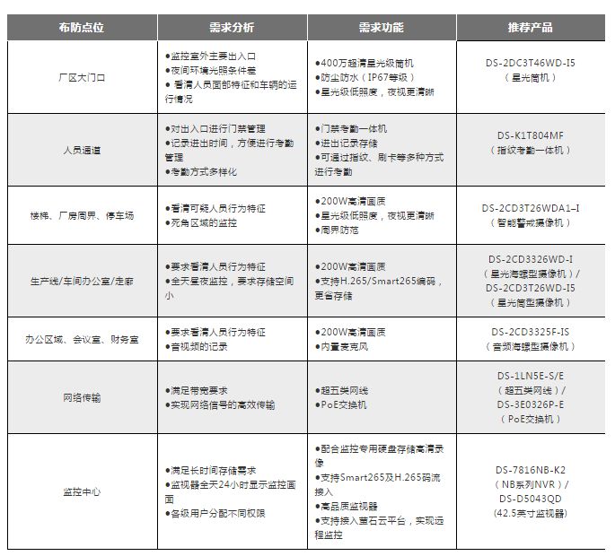 針對工廠的環境,我們設計了一套完善的安全監控系統,為工廠提供了一套可實施性較高的監控解決方案。 本次方案的亮點在于應用了剛發布不久的海康威視智能警戒攝像機。該攝像機作為海康威視AI Cloud邊緣智能的一員,是智能IPC家族中的明星產品,采用適用于視頻監控場景的深度學習硬件及算法,具備精準報警、實時警戒、快速回查三大功能。 01 配單選型 02 點位設計 下面列舉幾個具體的點位分析 周界防范 針對工廠的周界防范,由于周界及圍墻范圍較大,區域較廣,一般使用高圍墻包圍,采用海康威視智能警戒攝像機,精準報警,有效降低誤報率,當場檢測到人或車時立即發出白光報警震懾,并實時遠程上傳報警消息至手機或電腦,便于及時采取防范措施。 廠區大門口 對于廠區大門口,進出車輛及來往人員十分眾多。這里我們推薦400W星光筒型攝像機。對門口進行監控,星光級照度,滿足日夜監控的需求,適用于重要點位的監控。 人員出入口 針對廠區人員管理,主要包括人員進出權限管理和考勤打卡,這里推薦指紋門禁考勤一體機,結合門禁管理與考勤管理于一體,安裝簡單,適用于主要出入口的人員管控。 生產線 廠區生產線作為工廠里的重要場景之一,在監控系統中也十分關鍵。針對生產線的監控,我們主推海康威視星光級海螺/筒型攝像機,該產品主要應用于安防系統重點區域的監控,其優質的成像效果和強大的環境適應性,可以保證對整個生產線進行全天候的監控。 會議室/財務室 類似于財務室/會議室等區域是廠區的重點區域之一,人員密集,活動頻繁,且涉及到許多企業安全信息。我們推薦音頻海螺型攝像機,外形小巧,功能強大,出廠自帶麥克風,支持音頻錄制,從而協助企業進行內部的信息安全管理, 03 系統拓撲 04 系統亮點 全面防范:整套工廠視頻監控系統,覆蓋廠區周界、走廊、辦公室、生產線等方位,能全方位保障工廠安全。考慮到一般廠區較大,周界防范采用智能警戒攝像機,精準報警,有效降低誤報率。 簡單方便:本方案中大多為PoE設備。PoE設備只需布網線,無需鋪設電源線,省去部署供電系統和線路所需的時間、精力和花銷。 維護成本低:相比與非PoE方案,拓撲節點少,維護概率低。 遠程監控:通過螢石云平臺,可以實時查看現場情況,回溯歷史錄像。布防時間內,當警戒區域有人/車進入,事件消息將第一時間推送至手機客戶端,管理人員可以通過手機查看現場情況并及時做出響應。 當然,具體場景,具體分析,畢竟大家大多數是經驗豐富的老司機,場景規劃和產品選擇已經熟門熟路了,比小編厲害多了!