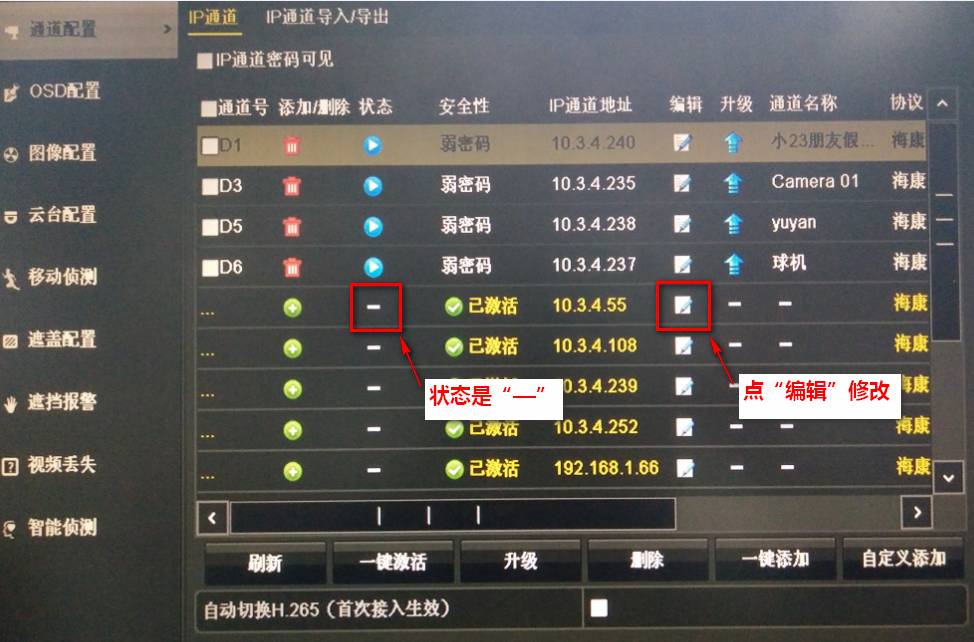 今天給大家提供兩種通過 NVR 修改攝像機IP的方法進入錄像機的主菜單—通道管理—IP通道,查看IP通道的狀態。進入編輯IP通道的界面,輸入需要修改的攝像機的IP地址,輸入攝像機正確的密碼,點確定。