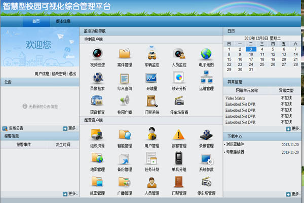 針對校園安防建設需求特征,iVMS-9600平臺還支持校園特色應用,包括校園廣播、基于手機客戶端的校園巡更、考場監控的SIP網關接入和一鍵式文件化存儲等功能應用,以此提升智慧型校園可視化綜合管理系統綜合優勢。