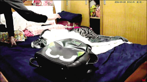 記者從王小姐提供的監控系統錄像片段中看到,當晚7時53分,大貓Max當時正趴在王小姐的床上,一名男子突然從畫面左側出現,只見他用左手撐著床,右手緩緩抬高,然后猛地一下往貓咪頭部拍下去。貓受到重擊后躲進床底,該男子拿來一把掃把,不斷用掃把柄往床底捅,幾分鐘后成功把貓抓起,提著貓的一條后腿連番踢打。